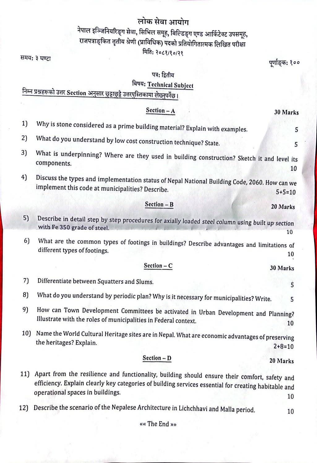 नेपाल इञ्जिनियरिङ्ग सेवा, सिभिल समूह, बिल्डिङ्ग एण्ड आर्किटेक्ट उपसमूह, राजपत्राङ्ङ्कित तृतीय श्रेणी (प्राविधिक) पदको प्रतियोगितात्मक लिखित परीक्षा